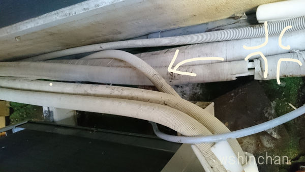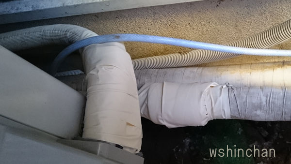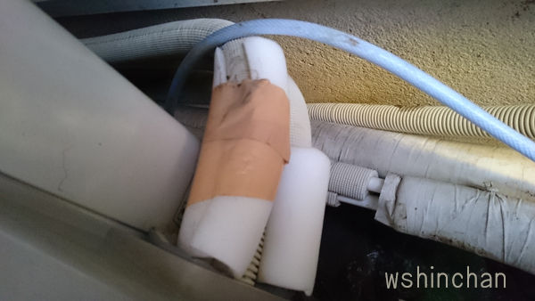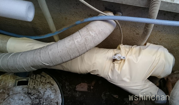(画像右)も、配管の断熱材をまいて、配管テープをぐるぐるにまきました。
