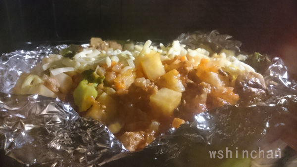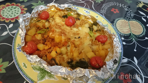 ↑グラタン皿を全て処分していたのでアルミ箔で作る。