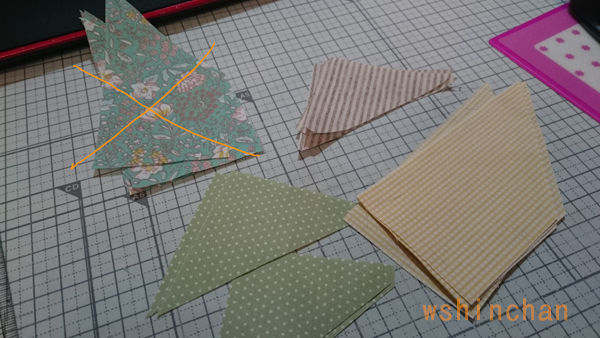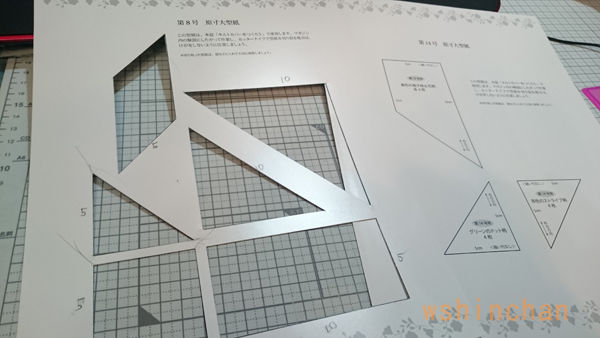 今回は、初の一辺だけ斜めの四角が登場するので、8号の型紙が使い回せない。↓