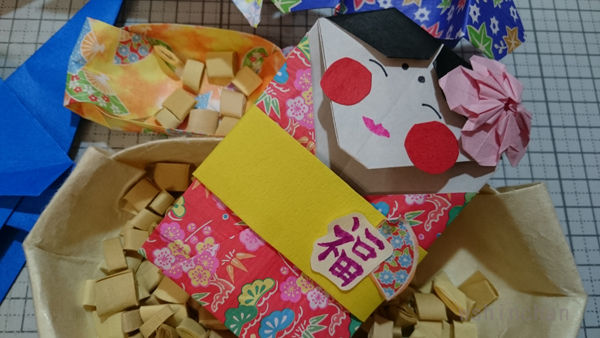 福の神のお面サイズの折り図がなかったので、過去の月刊折り紙の桃太郎のおばあさんを改造