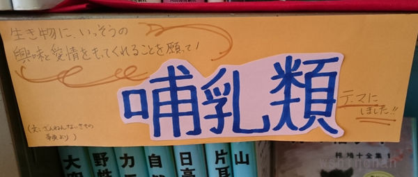犬猫はよくあると思うのですが哺乳類とか意外なテーマでいろいろ探し出せて楽しかった。(あと1棚あれば良かったかな。ちなみに同じ生き物でも魚・昆虫系は外しています)