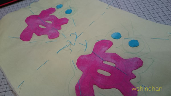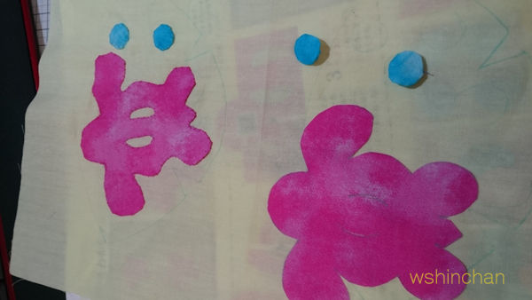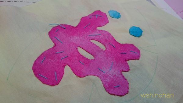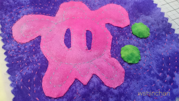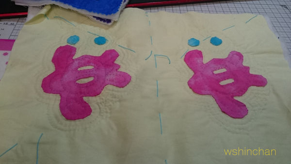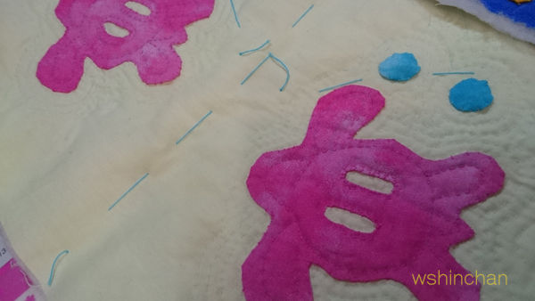 アップリケ付き・キルト芯・当て布を合わせてしつけをする