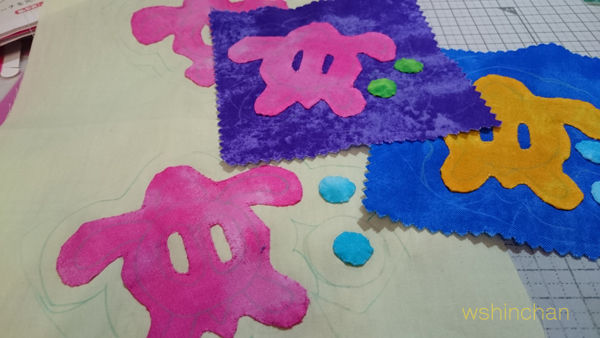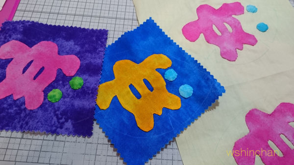 今回は、キャシーといっしょにハワイアンキルト5号のホヌのミニポーチの生地です。