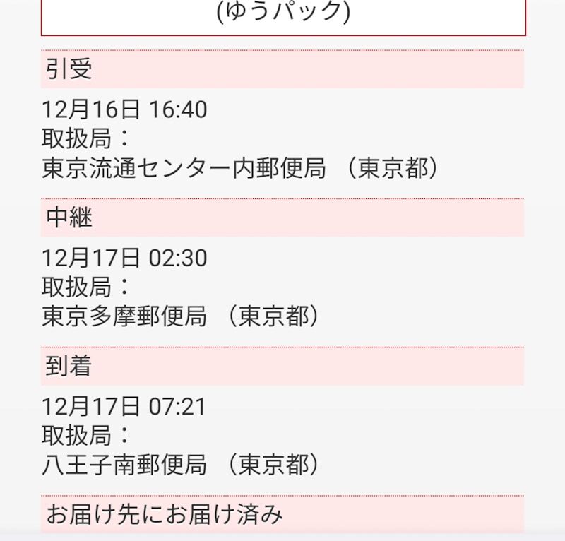 昨日の夕方流通センター内の郵便局で依頼した荷物が今朝八王子の自宅に!