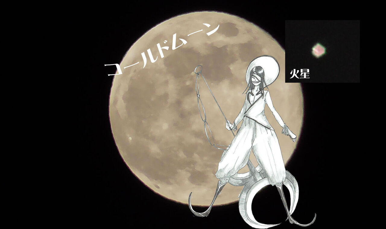 2022年12月08日 今日はコールドムーン★ノイトラと火星と月 今日は月が火星に近付くと、理科の先生が熱弁していたそうな。私は、星系のニュースで知ってはいたのですが、あまり気にせず、19時頃窓から大きな満月が見えたので、火星と共に撮影。ビデオカメラで「画像」を撮ったのですが、火星はさすがに点しかならず、月と火星を撮ると月がぼけてしまう。ちょっと残念なので、さっき別件で描いていた BLEACHのノイトラを重ねてみました。星空ごよみ365日 2023BLEACH 33 (ジャンプコミックス) [ 久保帯人 ]*---☆---★---☆---*---☆---★--- < 前の記事次の記事 >